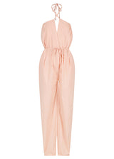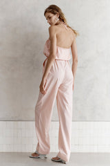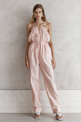 A chic alternative to more traditional maxi dress styles, the Cross Body Jumpsuit feels soft yet sophisticated with its wash of light pink and strength in details. Fine spaghetti straps cross the neck and adjust at the nape, running elastic through the top and across the back for max comfortability. The drawstring waist can be cinched tight for added shape.